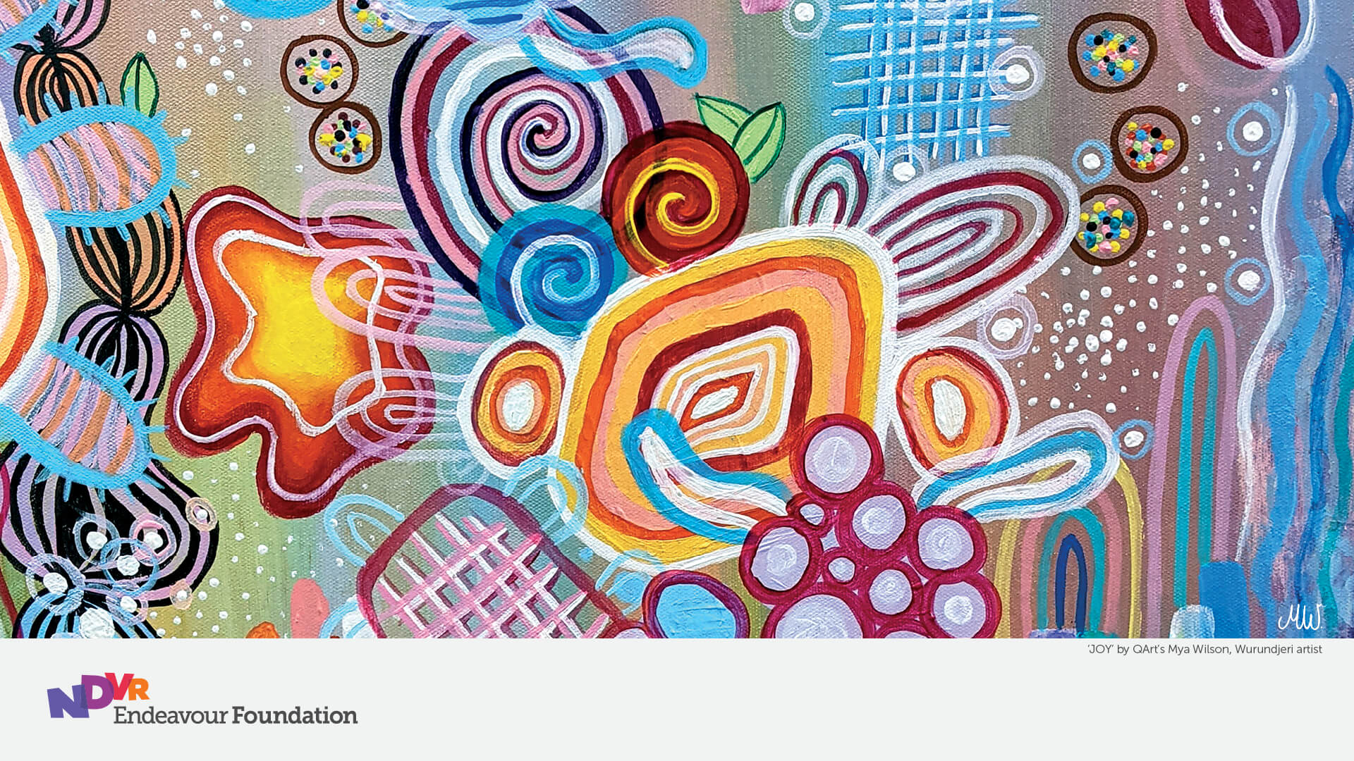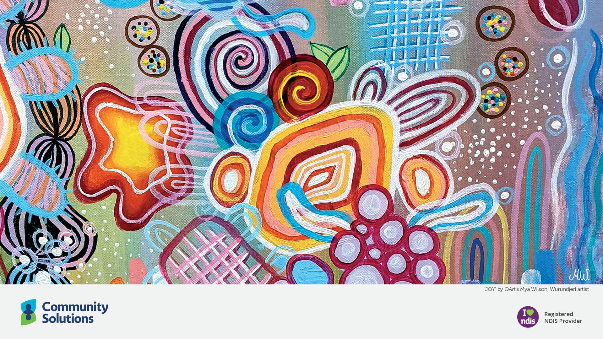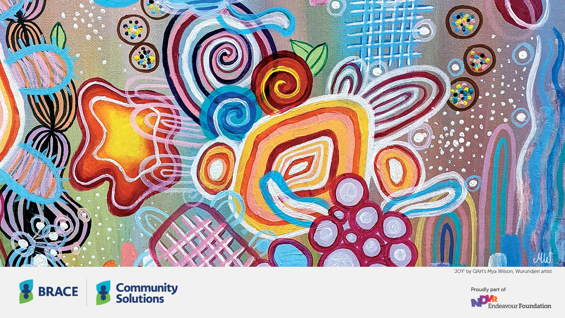 Our beautiful RAP artwork by Wurundjeri artist Mya Wilson can be used for your MS Teams meeting background, with logos from Community Solutions, BRACE, and Endeavour Foundation included.
