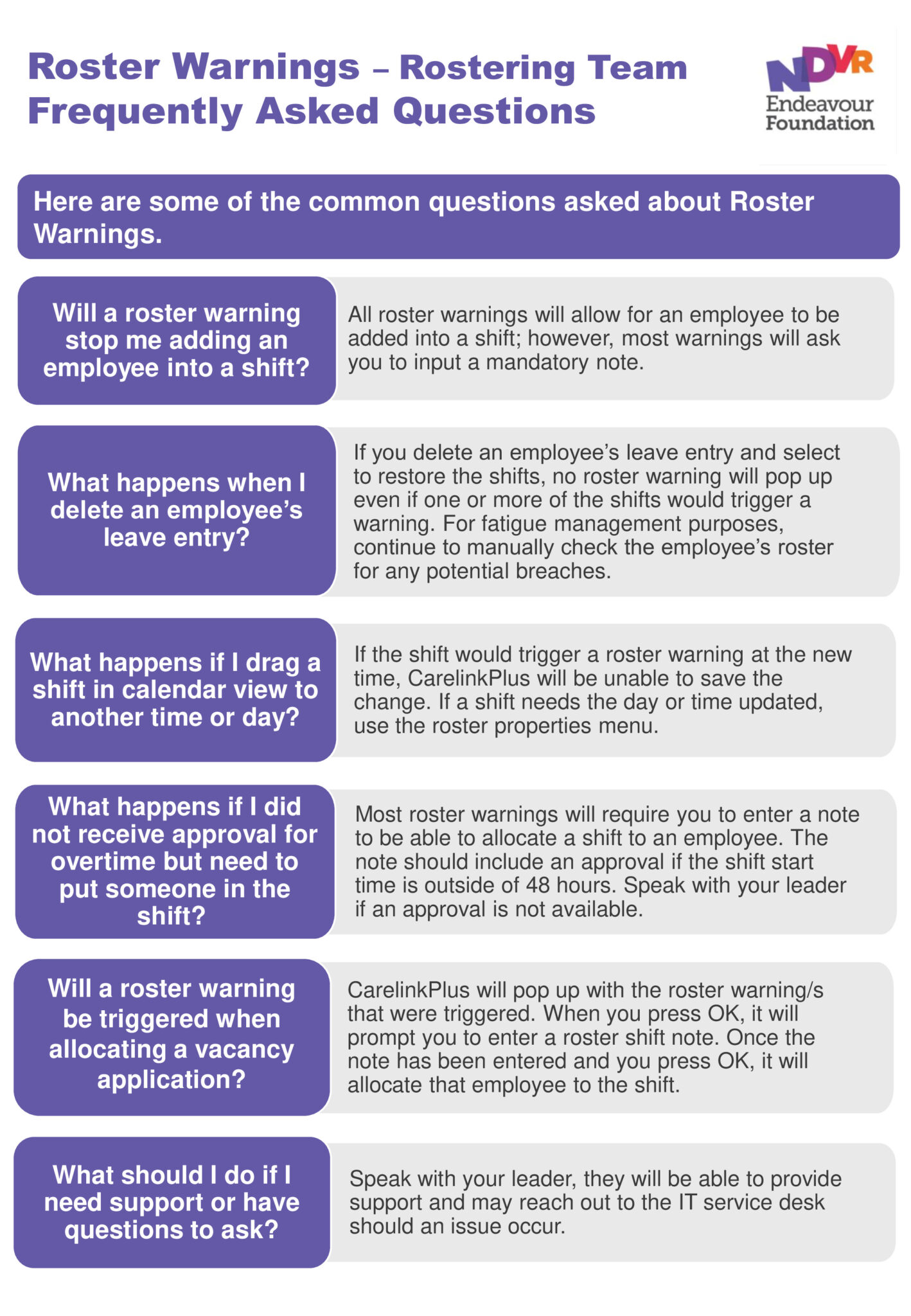 The roster warning process provides support and governance when rostering support workers into shifts. Resources have been developed for Rostering and Billing Officers explaining the actions to take when a roster warning notification appears: