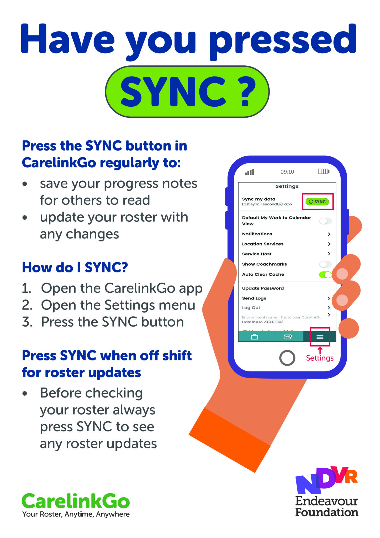 Sync the CarelinkGO app regularly to see the most up to date roster and to save and share progress notes with your team. Make sure you switch on app notifications to get the latest roster updates too!
