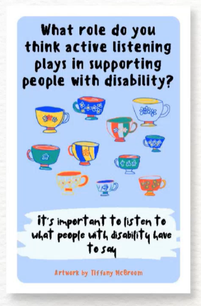Each card contains question relating to disability. The cards also feature an artwork created by one of QArt artists. This card game is an engaging tool to initiate discussions about the stigmas faced by people with disability. Using these cards with your team can help shift perceptions and encourage reflective conversations.