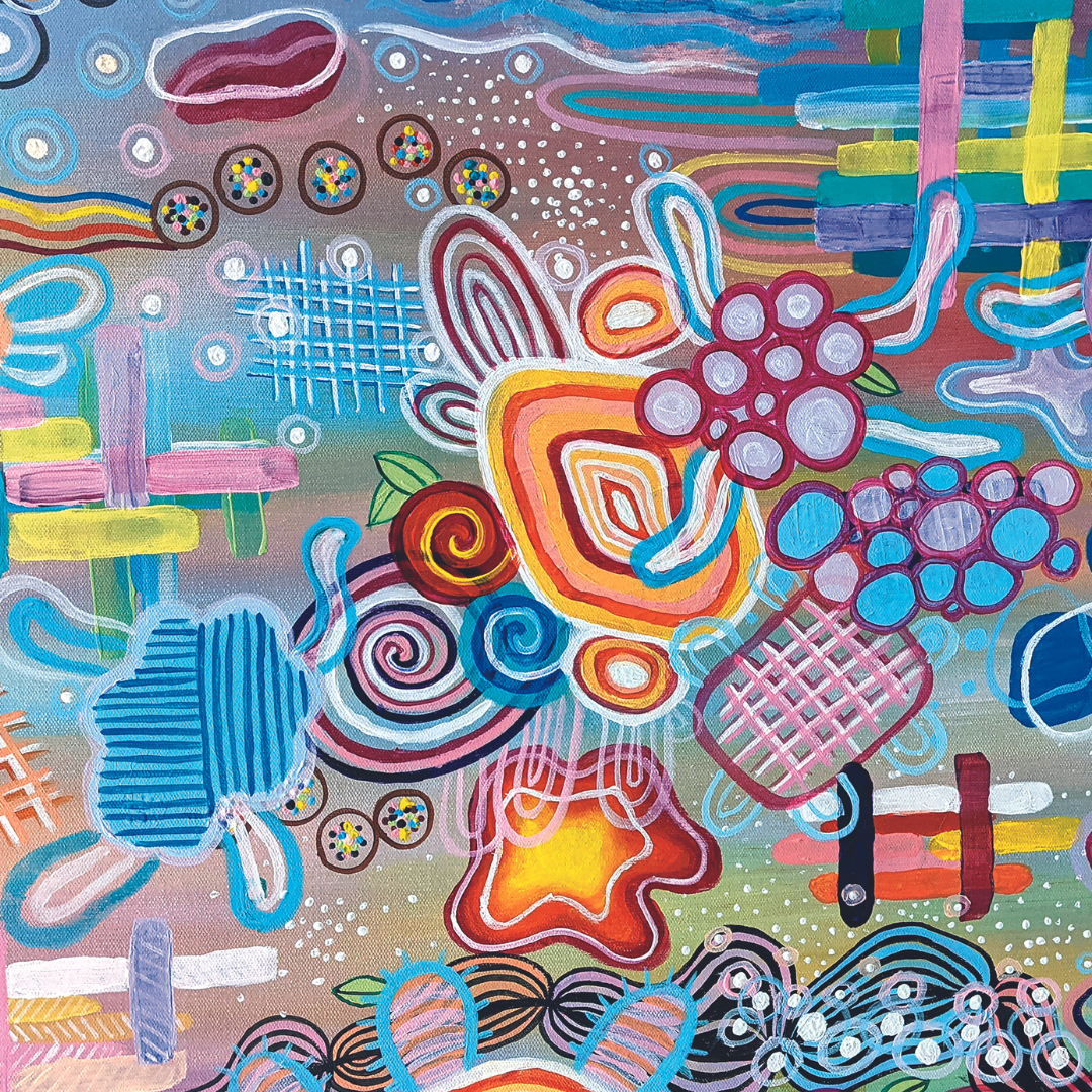 I have used modern bright pastel colours to lighten the mood. I wanted it to represent fun and give you happiness when you look at it. The intention is to create a feeling of happiness, growth and hope. I also wanted it to connect to the land too. For me, the land gives me joy.