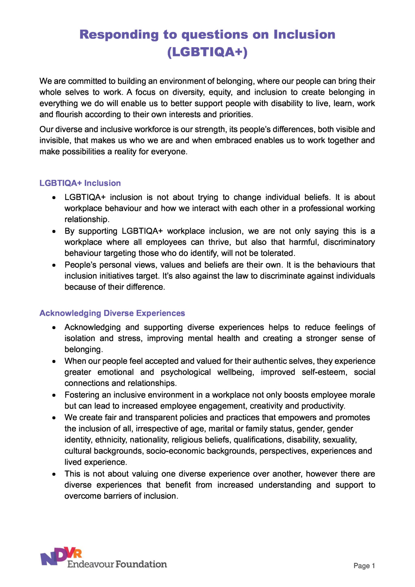 Endeavour Foundation acknowledges the universal rights for all people with disability to have respectful relationships, express gender identity, to be respected by support staff and to be treated equally in all areas of life. It is our responsibility to uphold the rights of people with disability in all areas of their life and approach everyone with respect and understanding.