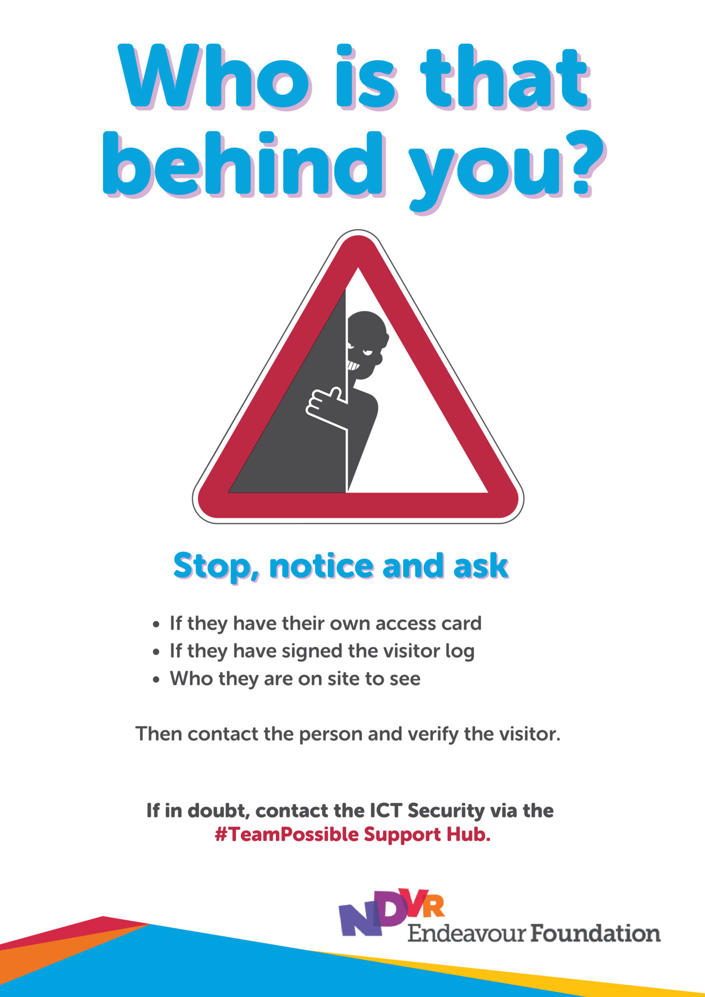 đ Report suspicious behaviour -If you notice someone attempting to enter without proper ID or acting unusually, notify ICT Security or the site supervisor immediately.