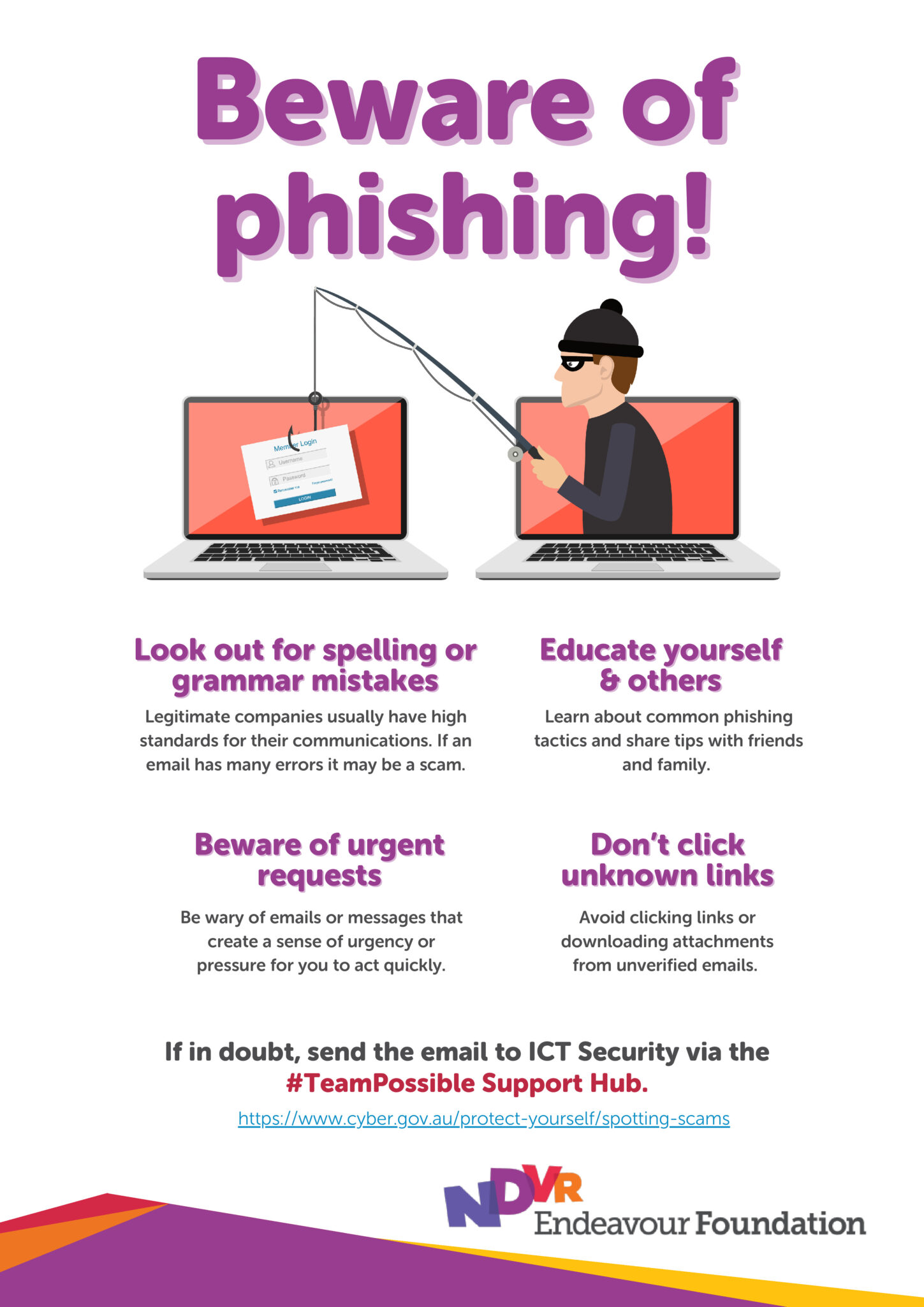 It’s important that we keep Endeavour Foundation safe from cyber threats. One important aspect of cybersecurity is understanding scams; which are becoming more sophisticated, and cybercriminals are constantly finding new ways to trick us.