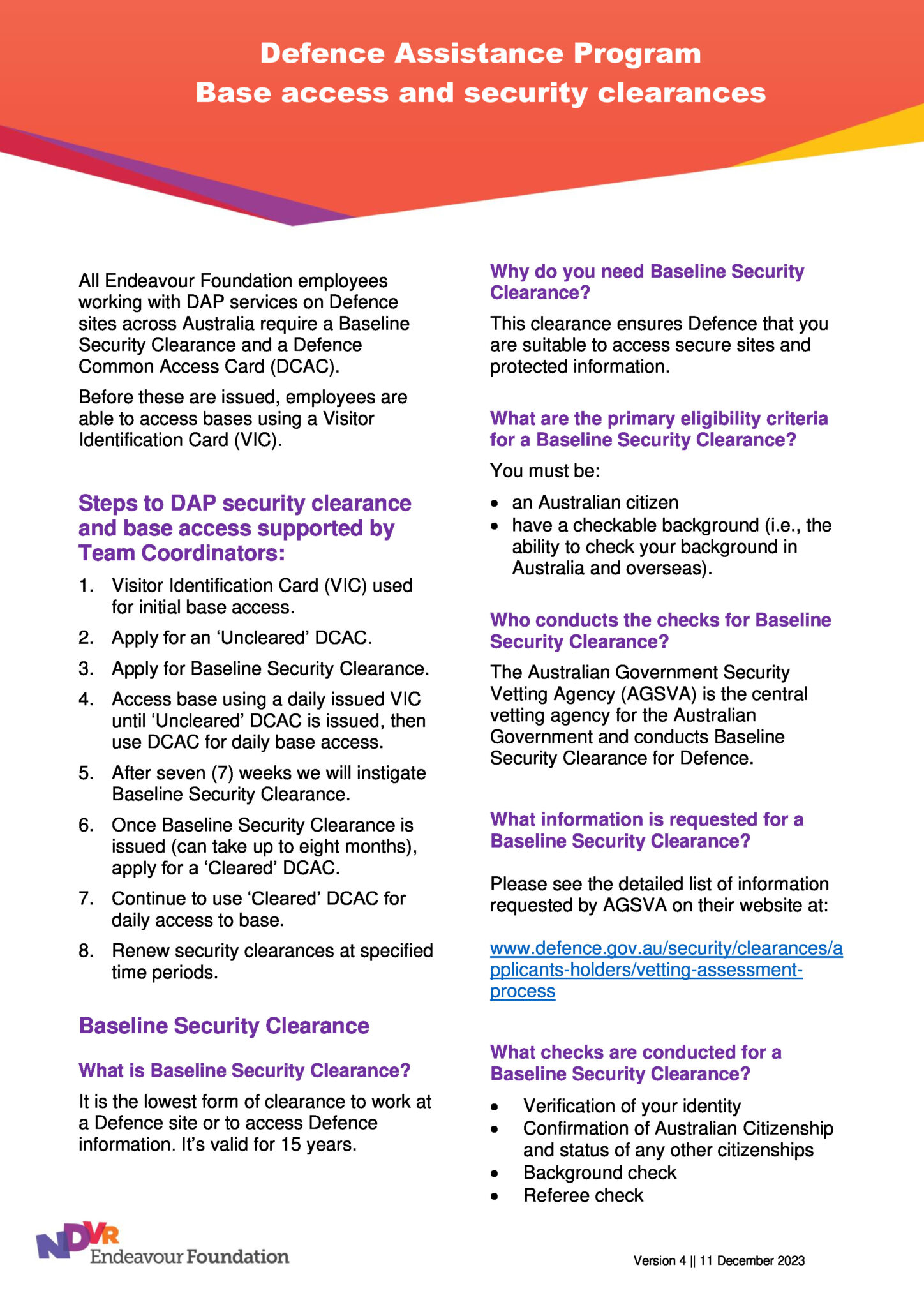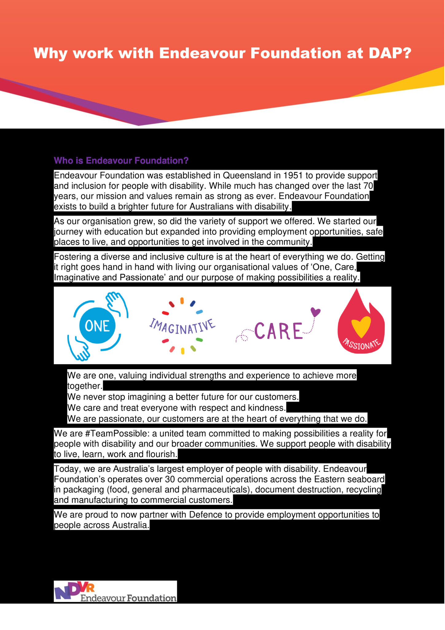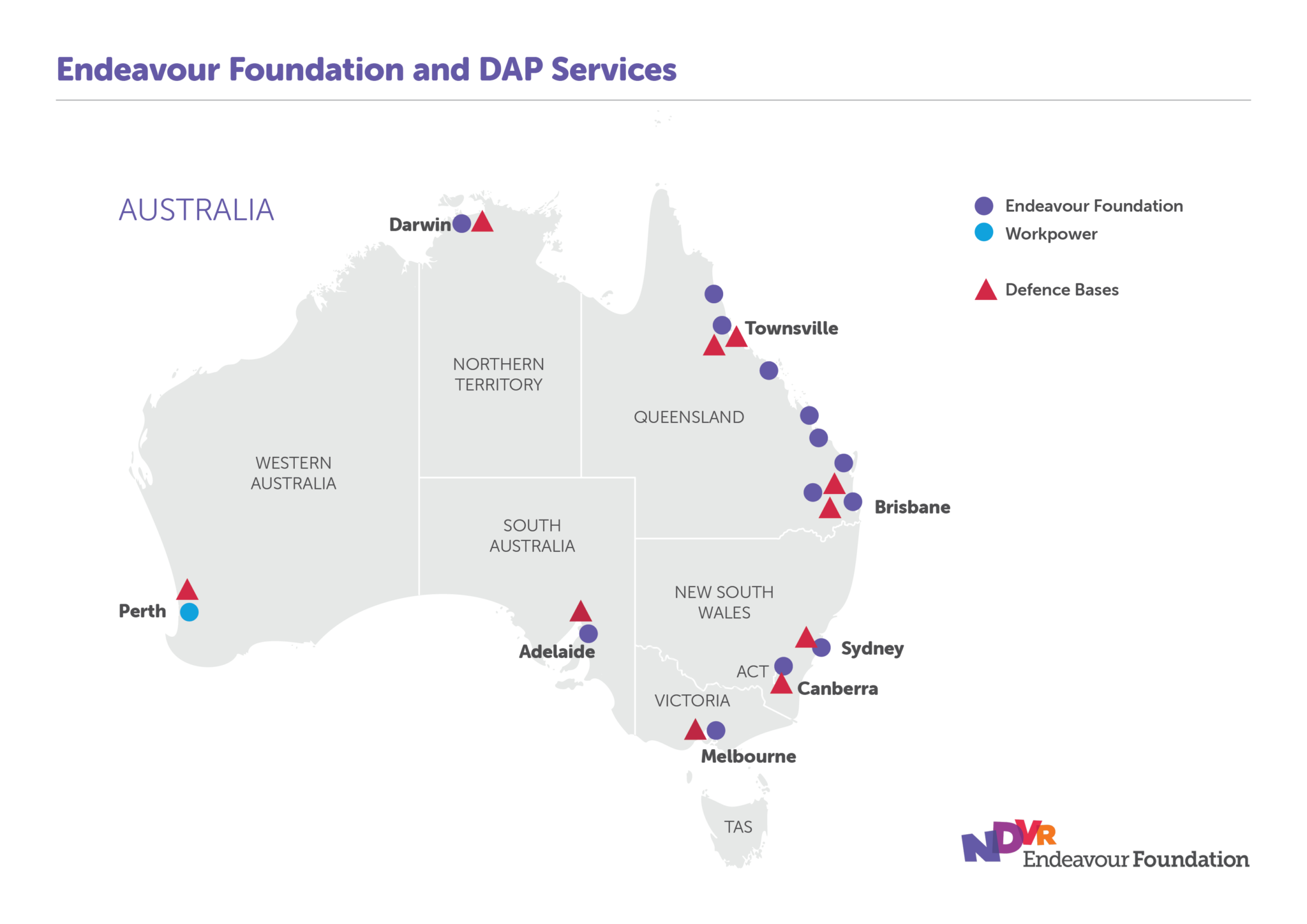 The Defence Assistance Program (DAP) has been successfully operating since 2014. Through the three-year contract with Defence, we manage DAP providing employment opportunities for more than 100 people with disability at 10 Defence sites across Australia.