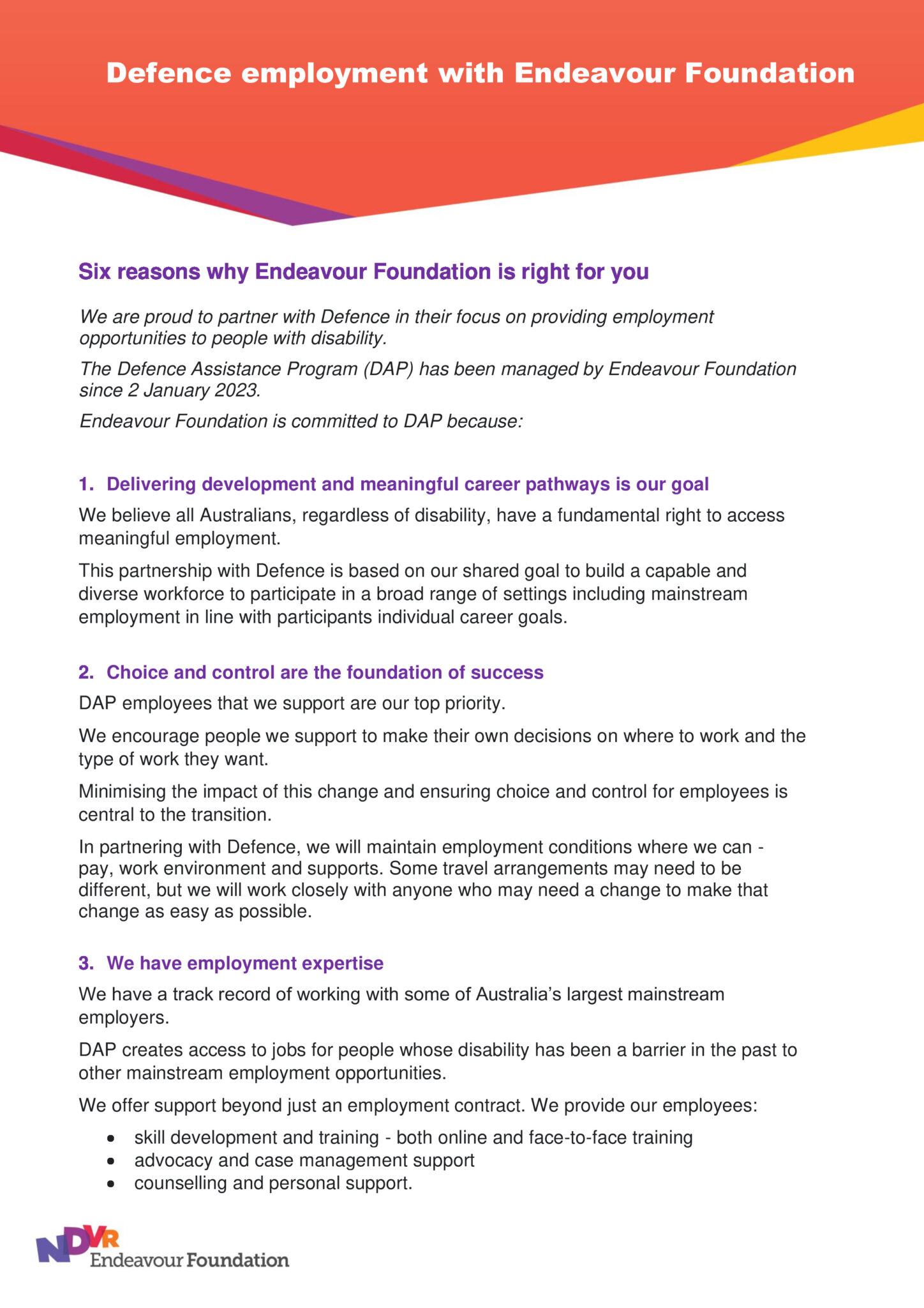We have partnered with Defence to offer our employees with disability the opportunity to work in mainstream employment at 10 Defence sites throughout Australia.