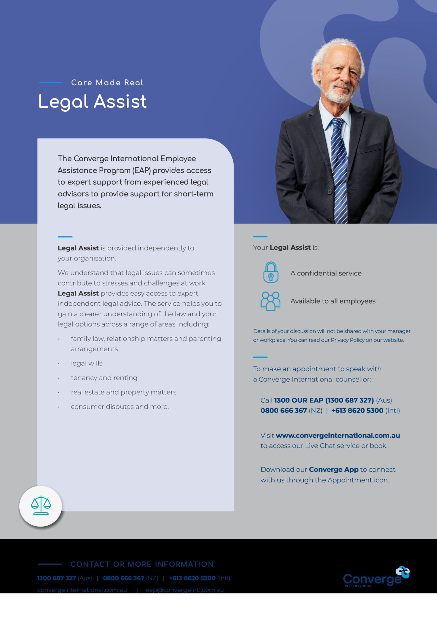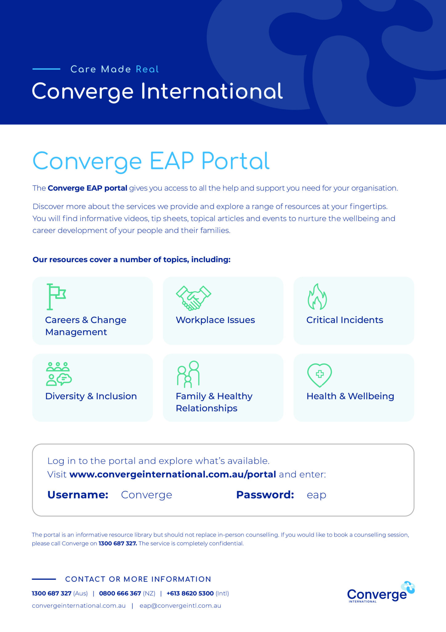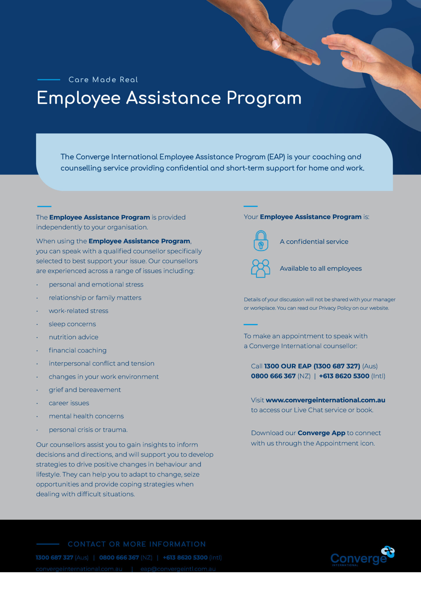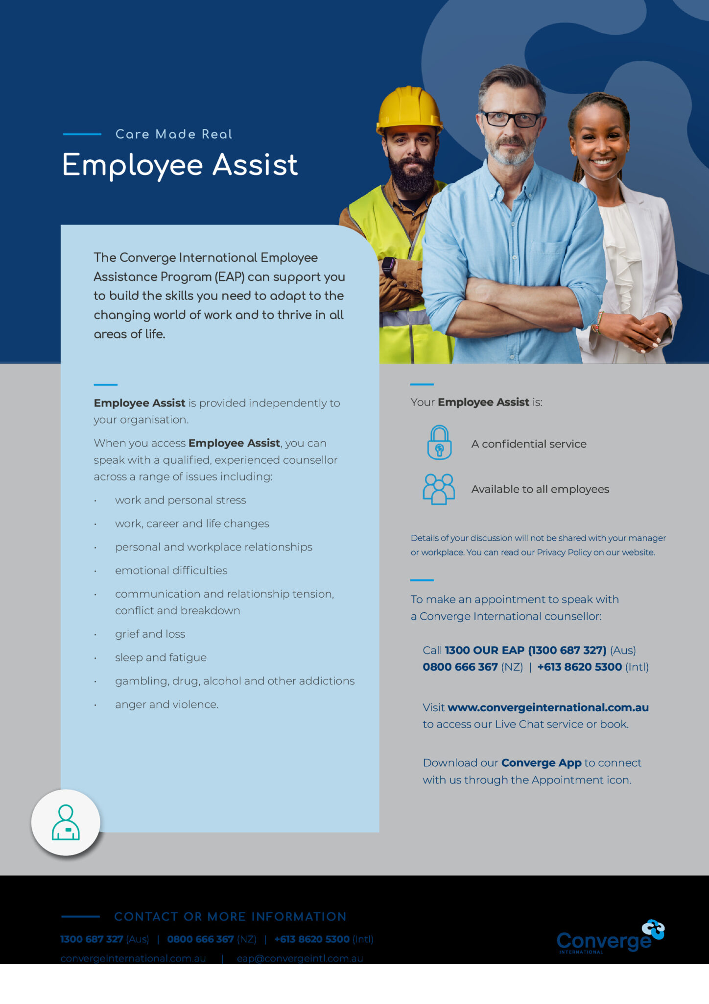 - Converge App: Engage with your counsellor via the Converge International smartphone app. When using the app, use the code ENFOEAP to book an appointment.