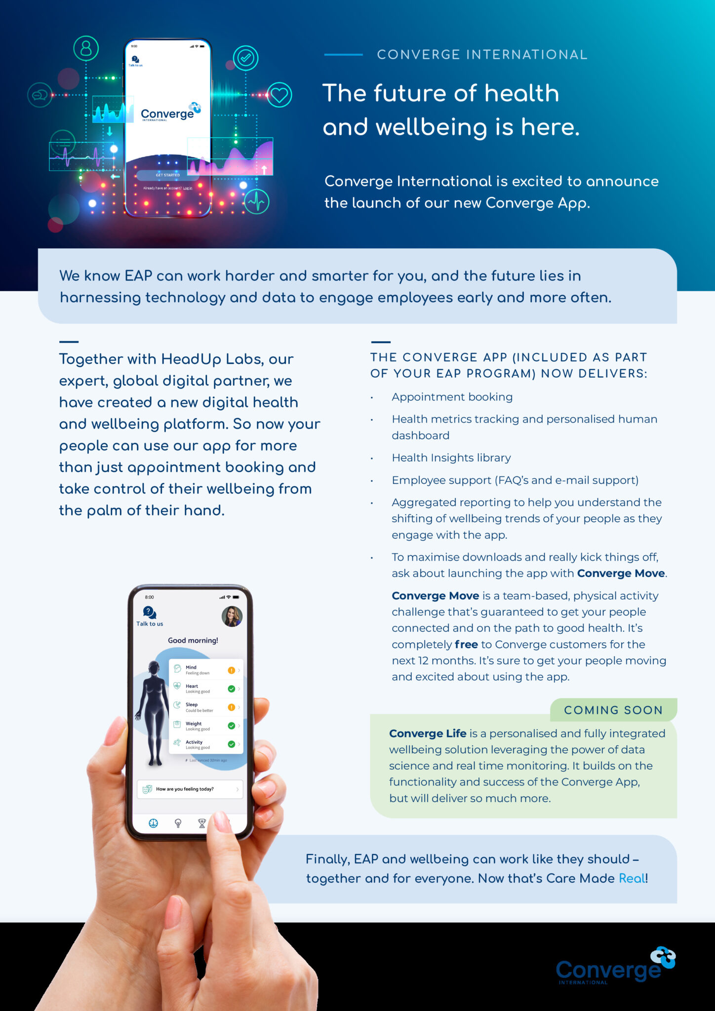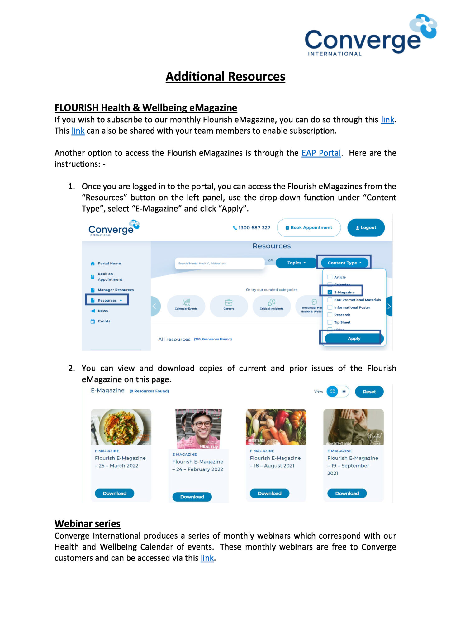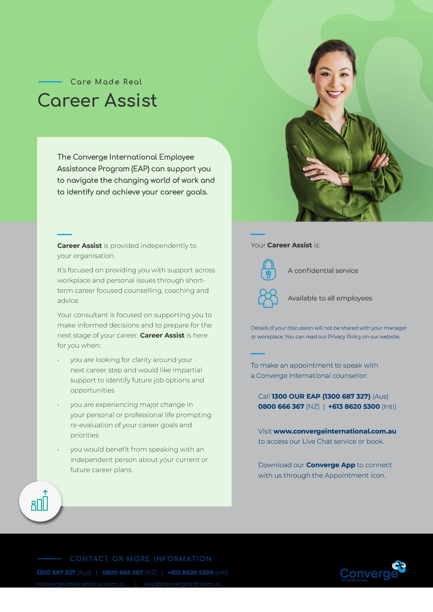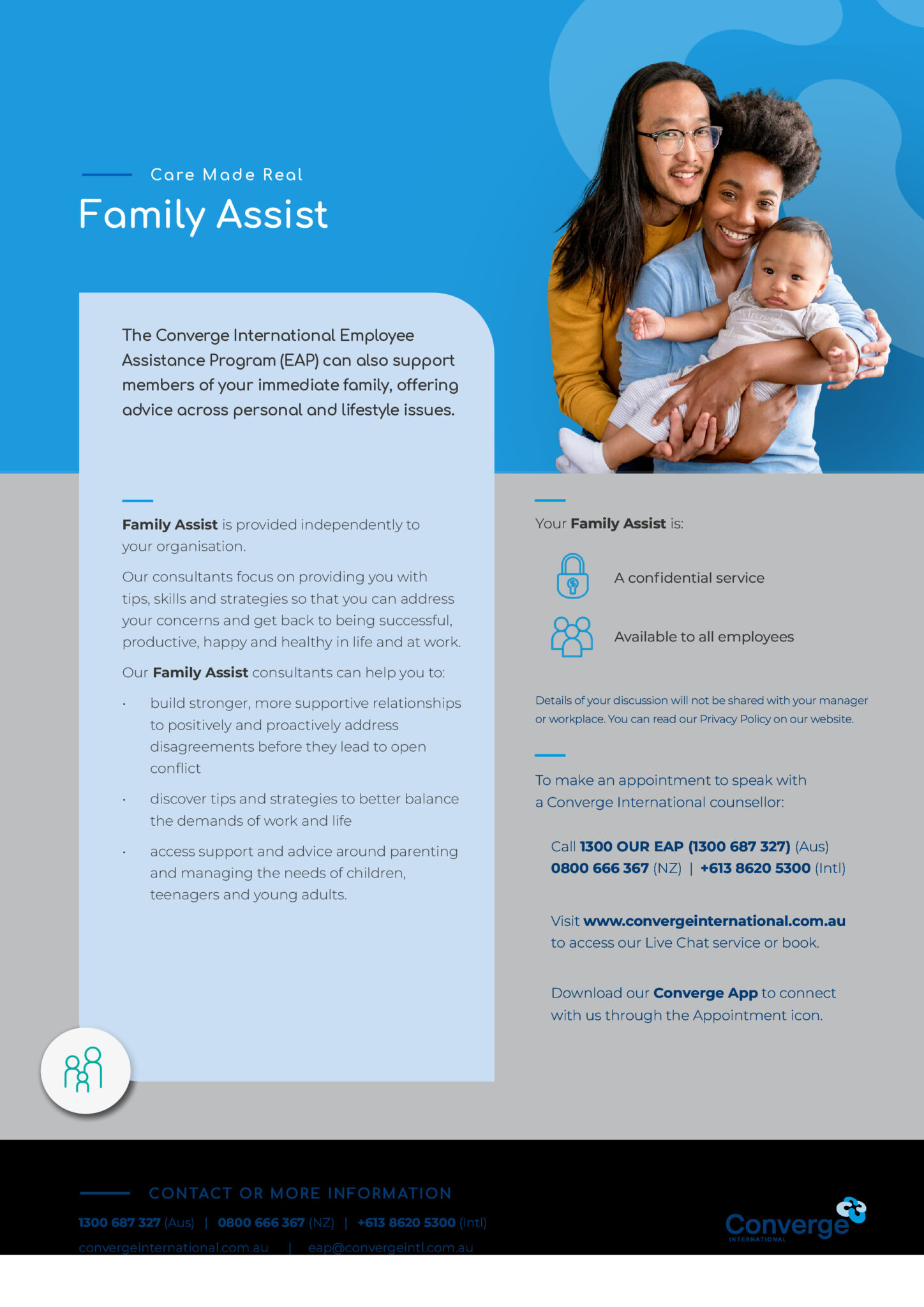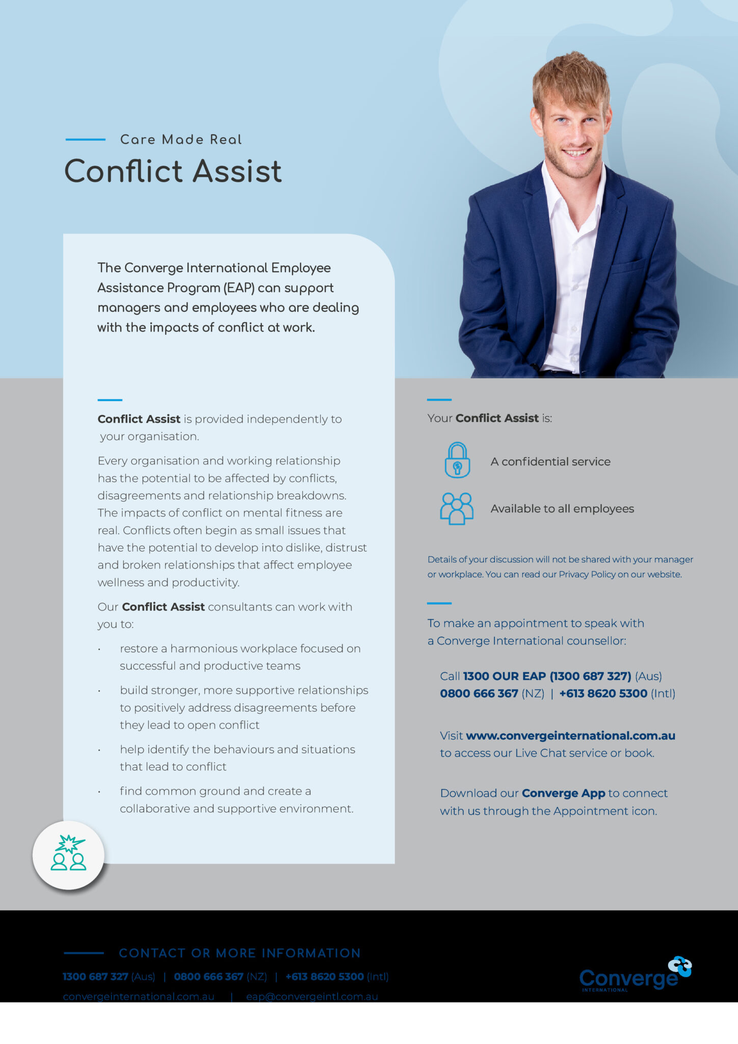 - Converge App: Engage with your counsellor via the Converge International smartphone app. When using the app, use the code ENFOEAP to book an appointment.