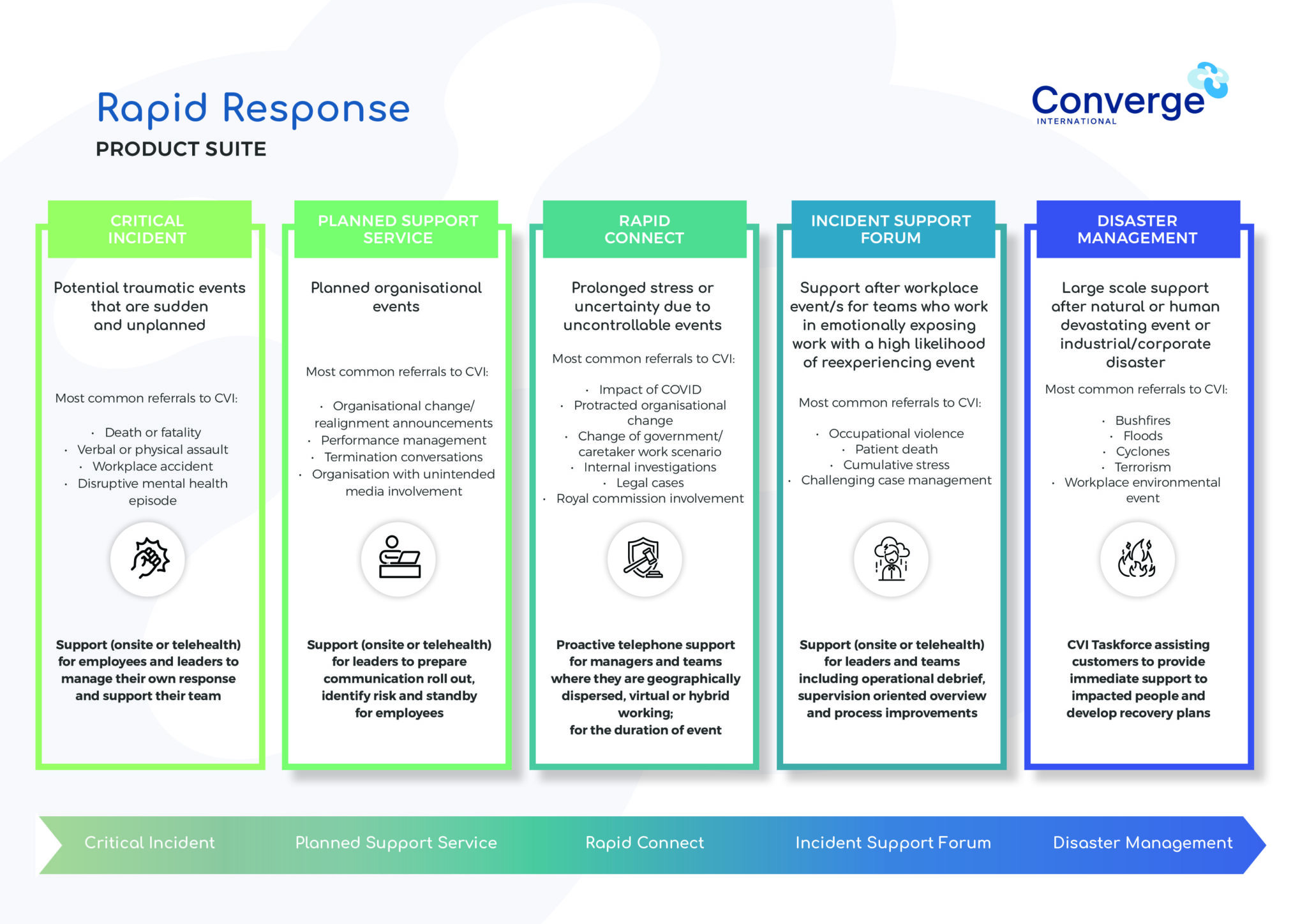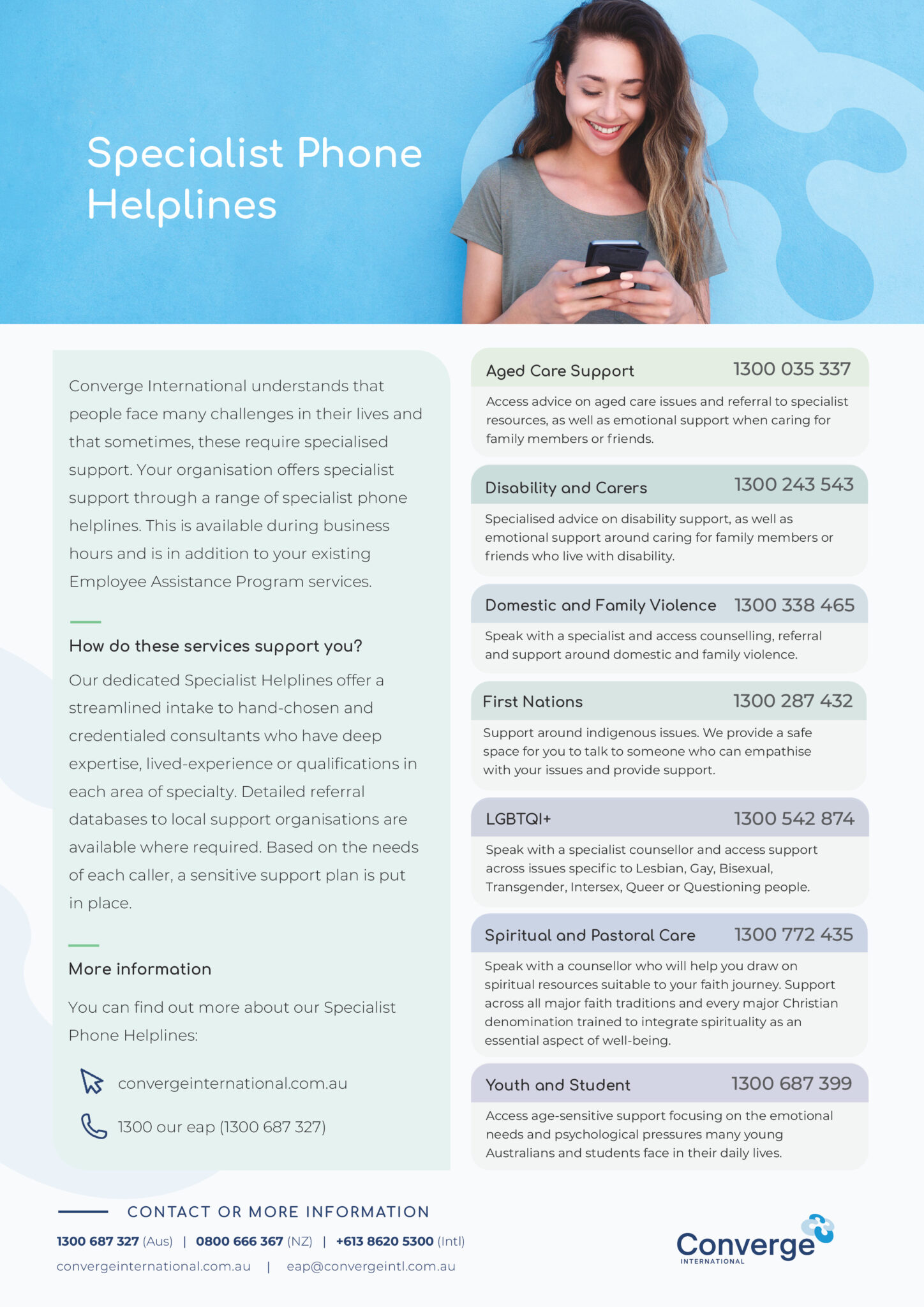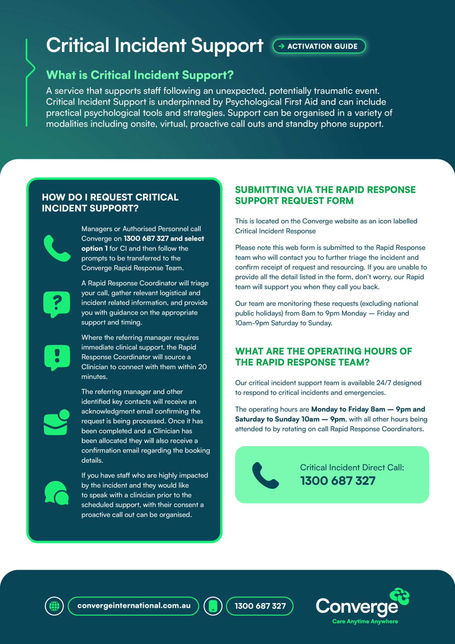 Converge International runs services from 9:00am to 7:00pm AEST Monday to Friday. Some services are available 24 hours a day, 7 days a week including crisis support, enquiries and booking requests.