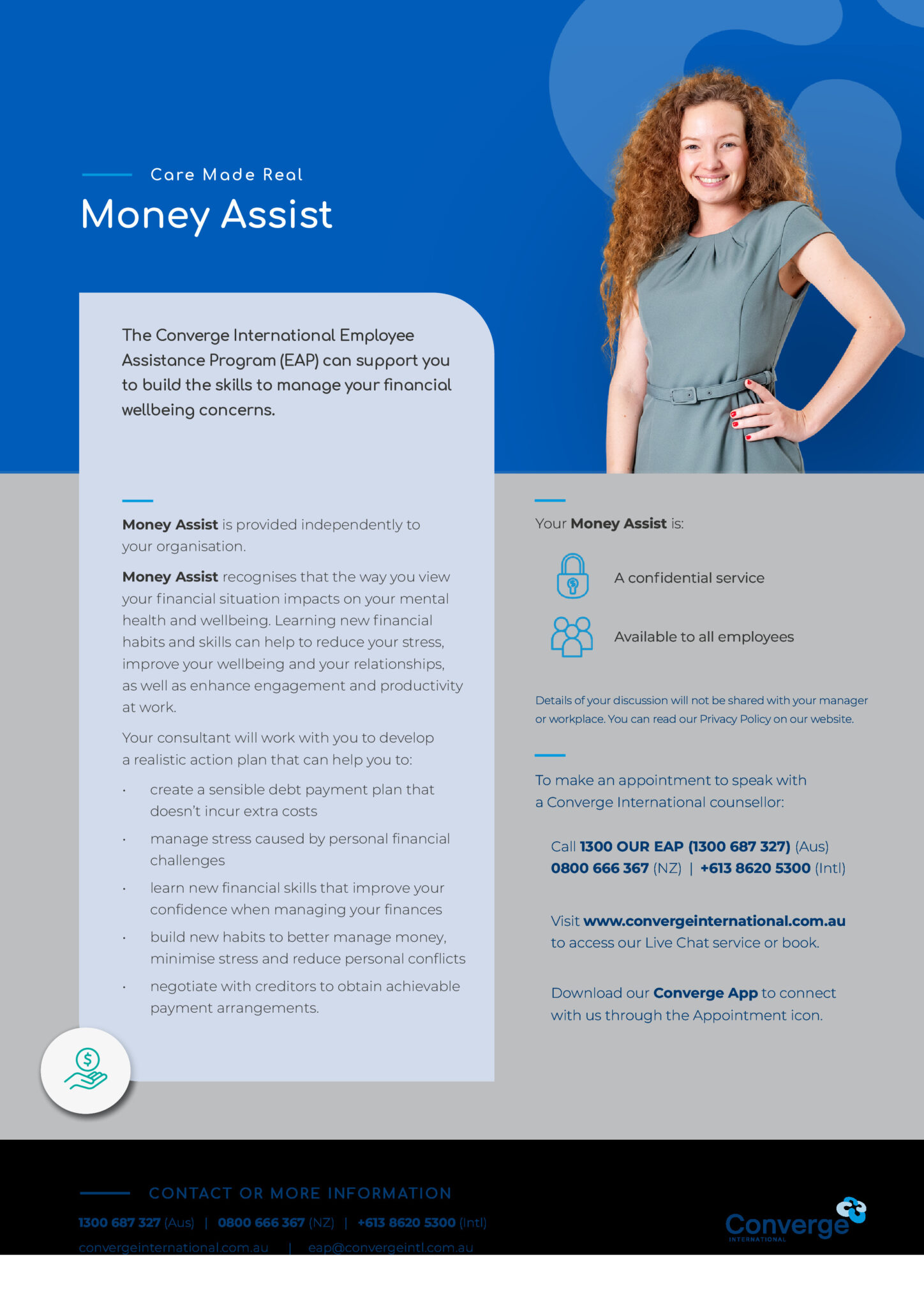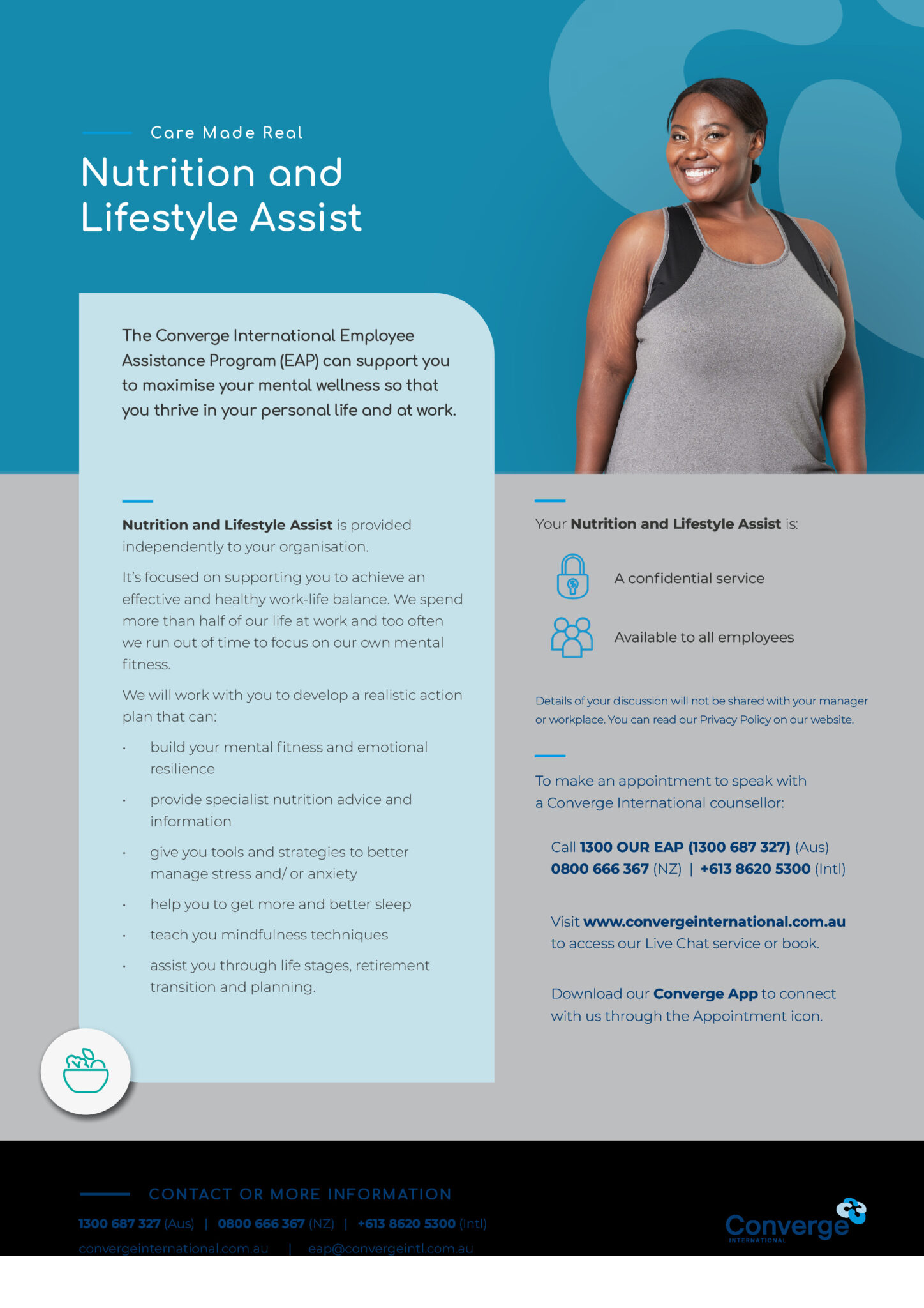 Converge International are Australia’s longest continuing EAP provider, and care for over two million Australians. They employ a multi-disciplinary team, with psychologists, social workers, specialist counsellors, mental health specialists, career coaches, certified mediators, nutrition coaches and financial coaches providing support. This means you will have access to a diverse range of professionals who can support your needs.