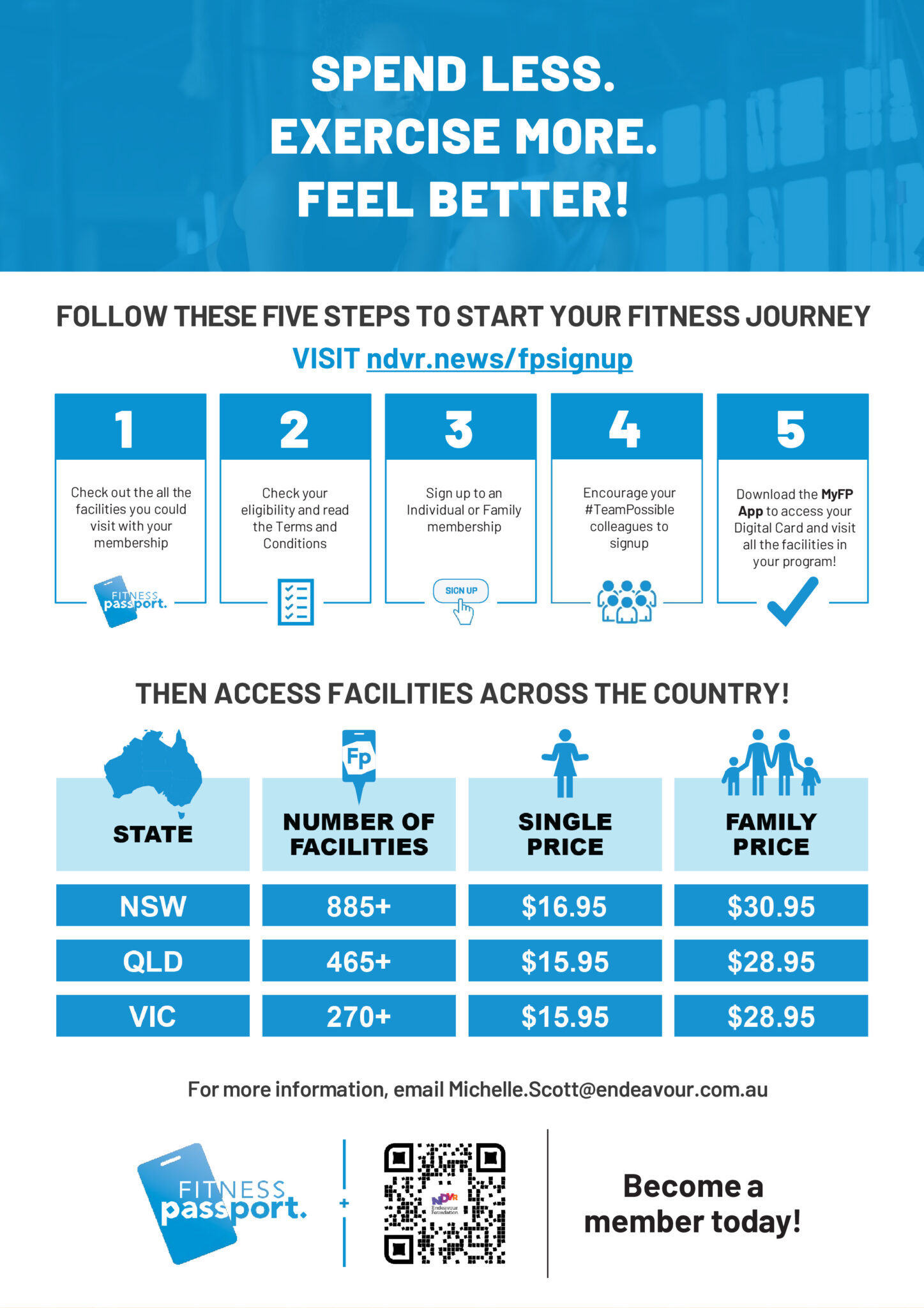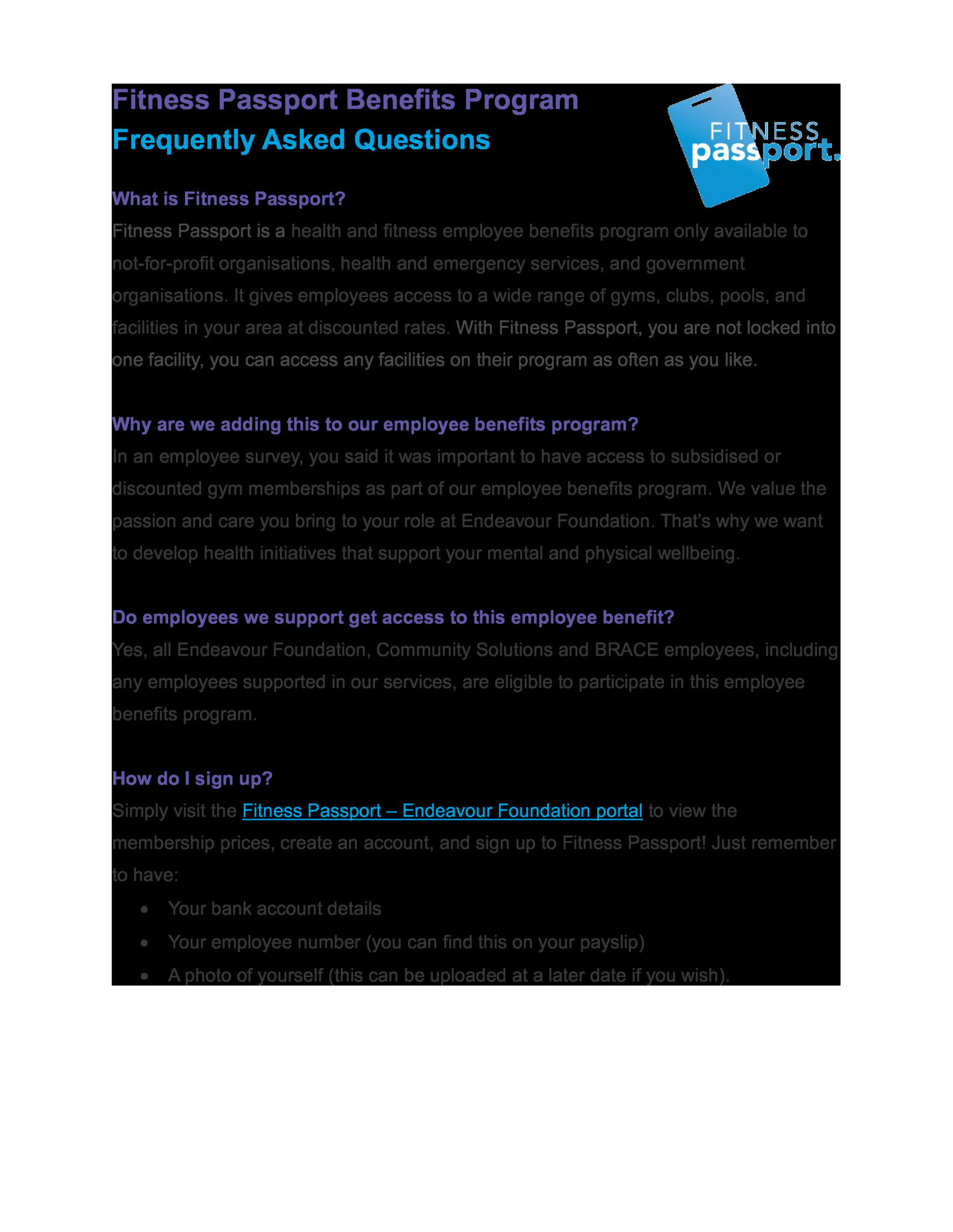 Once you sign up, our People and Wellbeing team will confirm to Fitness Passport you work for Endeavour Foundation, Community Solutions or BRACE, and you will have access to your Fitness Passport membership!