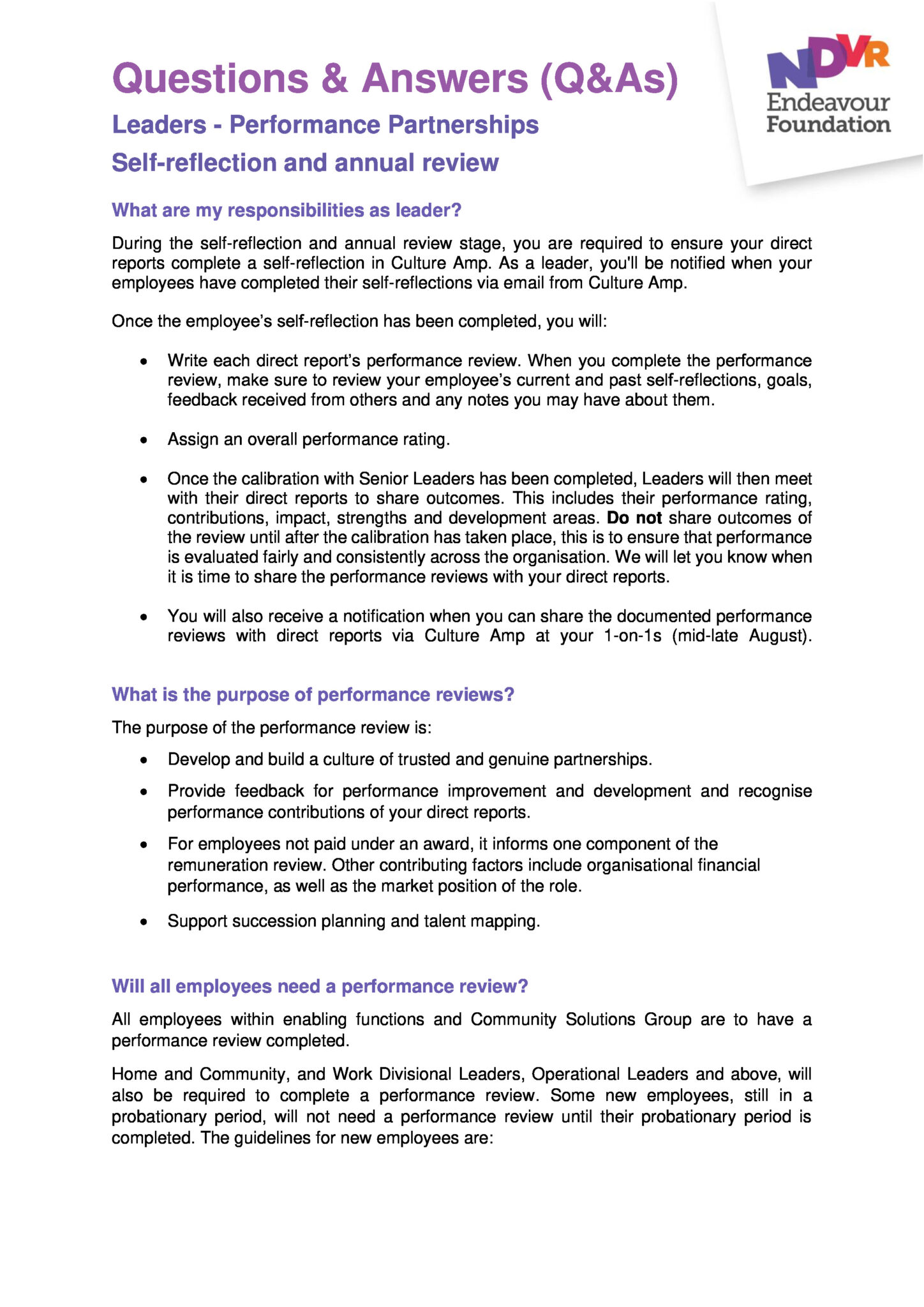 Self-reflection and feedback: A time to reflect on our achievements, learnings and areas of growth, and complete a self-reflection that is shared with your leader.