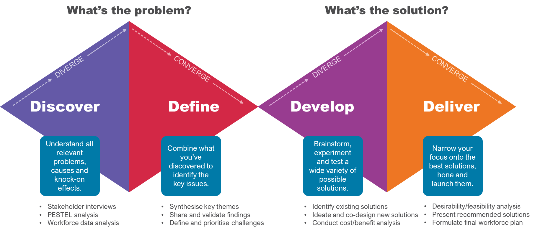 We partner with business leaders using a highly collaborative design thinking approach to identify current workforce challenges and future workforce goals. We bring together all the necessary people from across the organisation to ideate and innovate strategic solutions that we then refine and include as action items within the SWP.