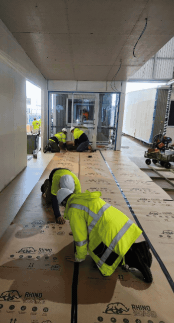 The first project involved preparing modular buildings for transport. Team members worked on tasks such as taping windows and vanities, as well as securing doors and other movable items within the completed structures.