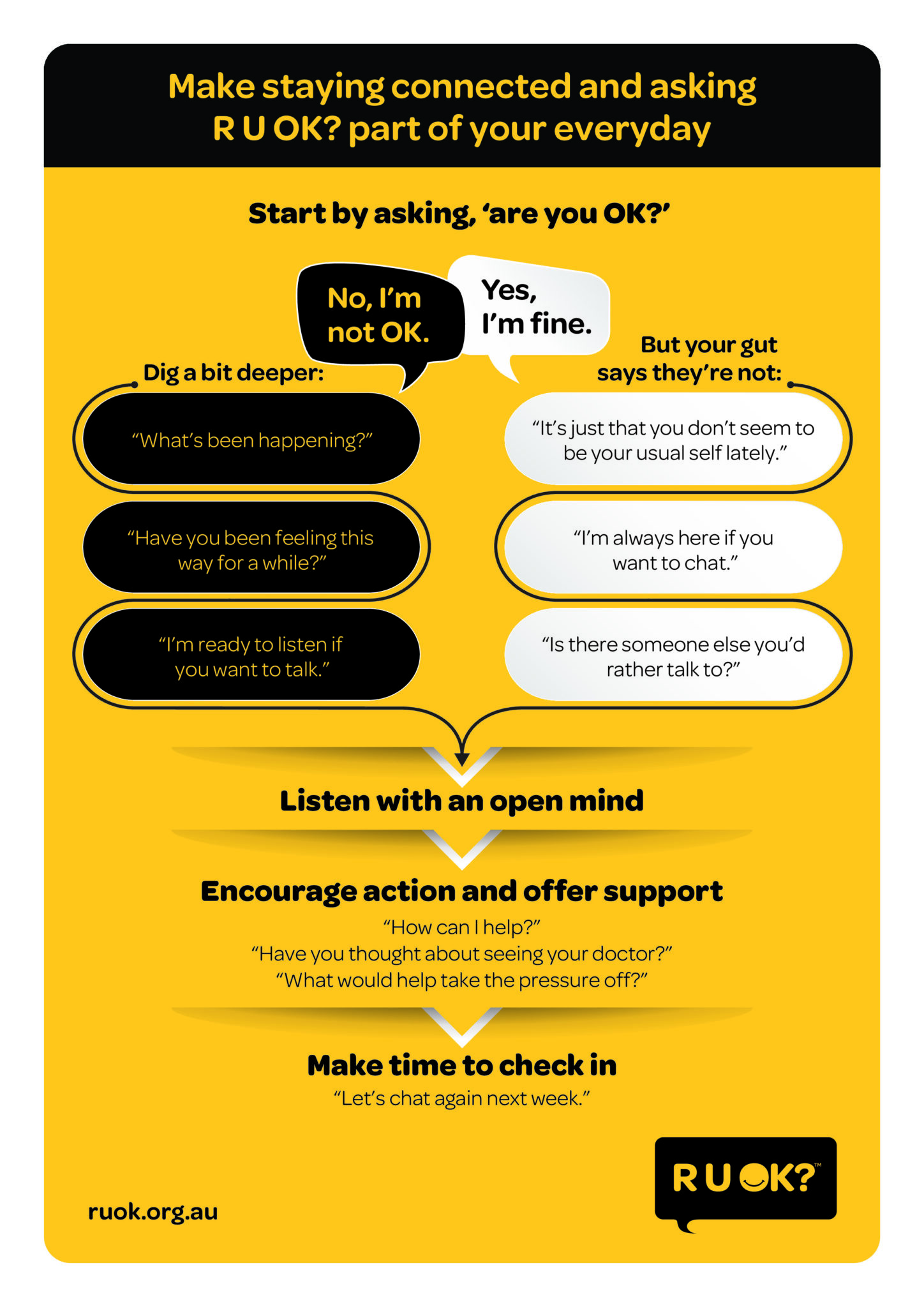 Thursday 12 September is R U OK? Day. This National Day of Action reminds Australians that every day is the day to ask, ‘Are you OK?’ and start a meaningful conversation with colleagues, family and friends.