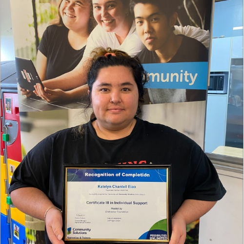 Katelyn Eiao in North Queensland who has a natural talent for supporting people with disability. Whether she’s tackling paperwork or tricky situations, she’s smashing it!