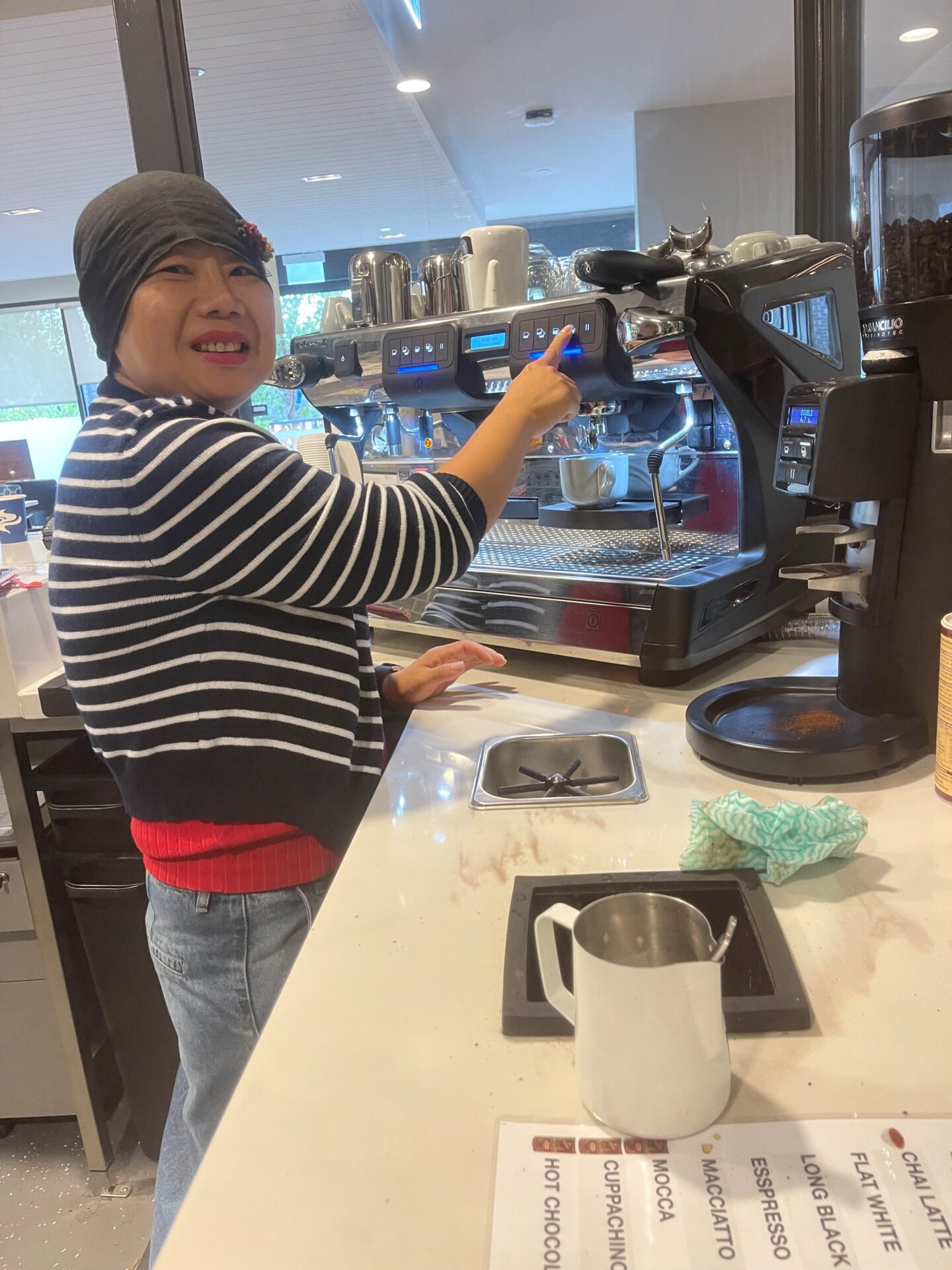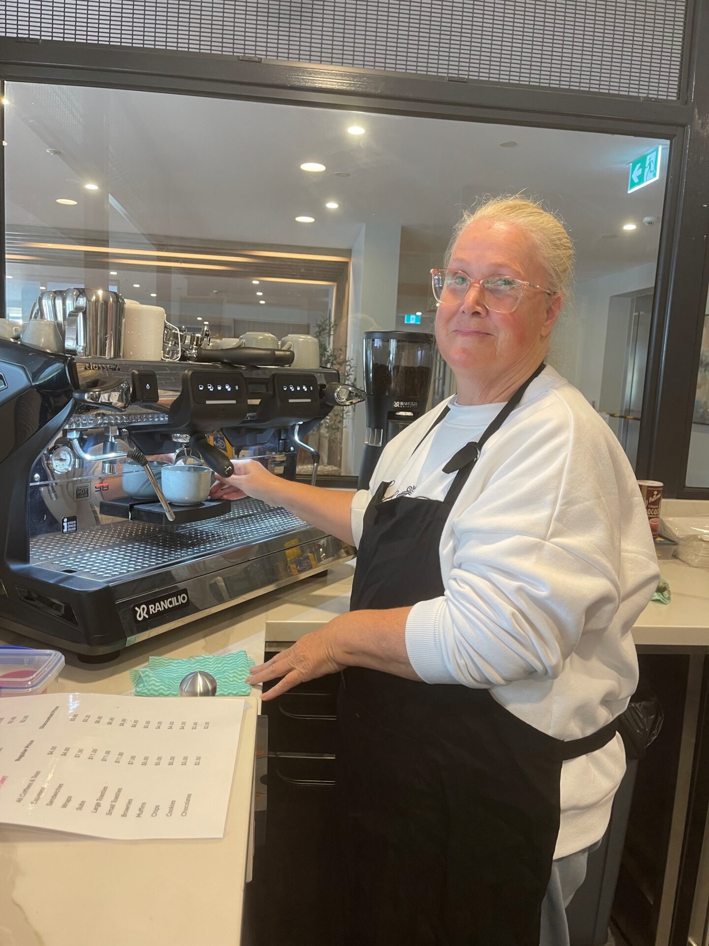 On Mondays, Cindy is all about supporting the team and picking up new skills. She helped with stock, tables, and even did the café’s weekly cash tally using the calculator. She took her first coffee order (three caps and a latte!), and while it was a bit daunting at first, she pushed through and delivered them with pride. She’s now learning how to manage vouchers from residents and staff and is eager to master tea-making next. She’s quietly capable and growing in confidence by the day.