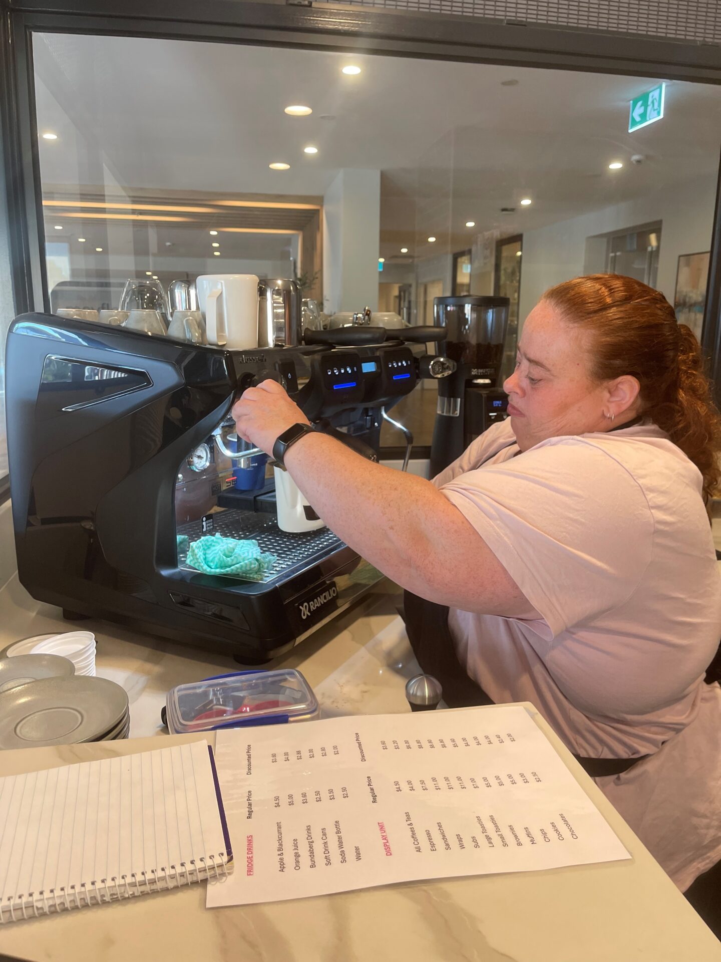 Tuesdays and Wednesdays are Sarah’s time to shine. She kicks off her shift by organising food deliveries, restocking the display, and even participated in a food-tasting activity to give feedback on a potential new supplier. Behind the coffee machine, Sarah serves up delicious drinks (those chai lattes got high praise!), and she’s keen to master even more, like macchiatos and teas. She also tracks fridge temps, fills out forms, processes payments, and keeps everything squeaky clean. All done with calm, confidence, and a big smile.