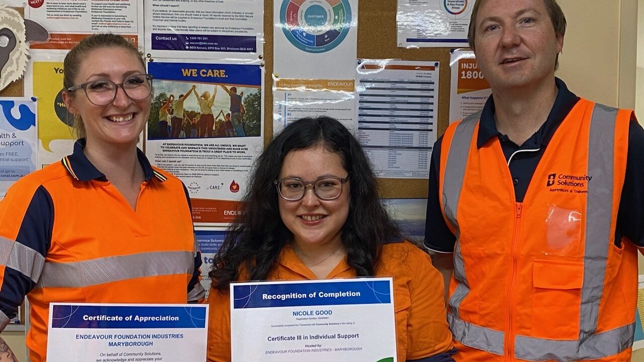 From her initial placement by Workforce Australia Employment Consultant David Foxell, to mentoring from Field Officer Teneal Kirby, and on-the-job training from Jessica Dullaway and Scott Reed at Maryborough social enterprise, this collaboration has allowed Nicole to grow, develop her skills and find her permanent place in the Endeavour Foundation family.