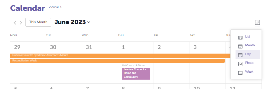There are multiple ways that you can view the calendar. To navigate to these views, click on the icon on the right-hand side of the page.