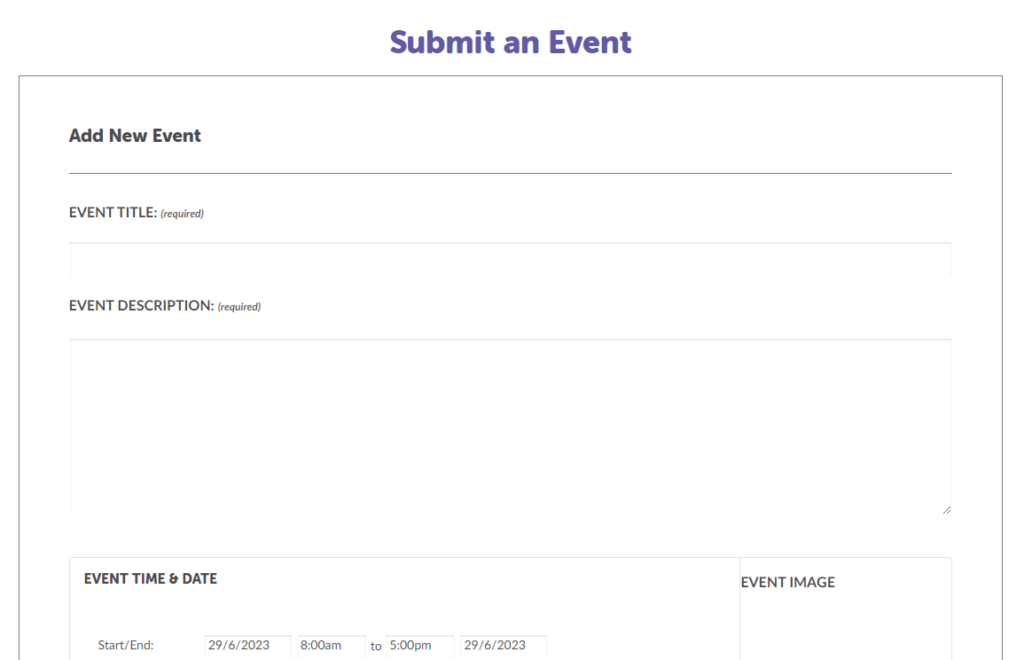 If you go to Calendar on the top menu, the Submit Event, you can complete a simple form. It will ask for details such as the title and description, the time and date, an image, venue and organiser details.