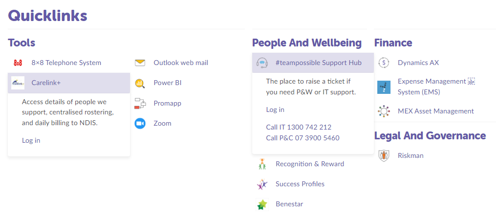 They are divided into four sections, Tools, People and Wellbeing, Finance and Legal and Governance.