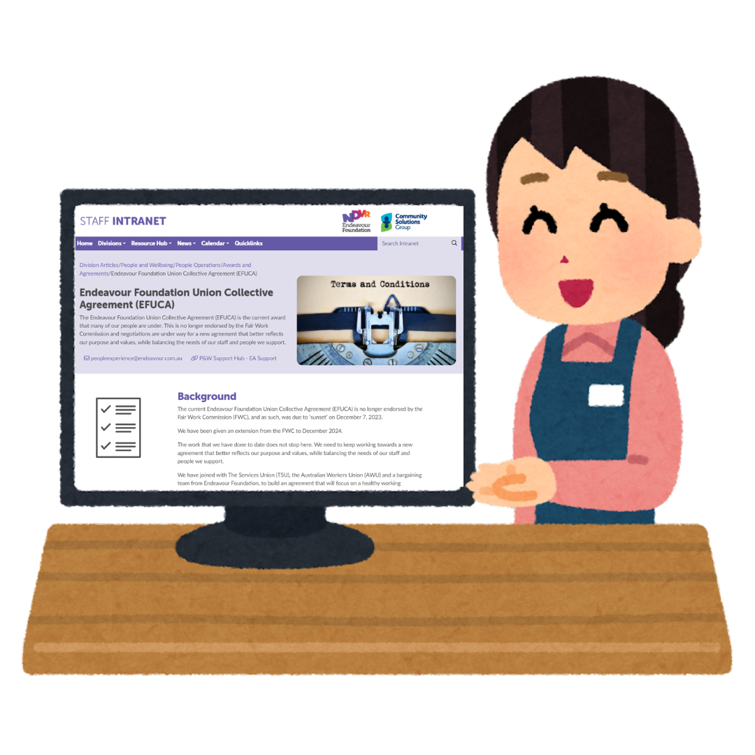 The unions have right of entry permits which enables them to follow a process and visit relevant Endeavour Foundation sites. The union notifies the People and Wellbeing team in advance of their visit so we can ensure the leader at the site is notified.