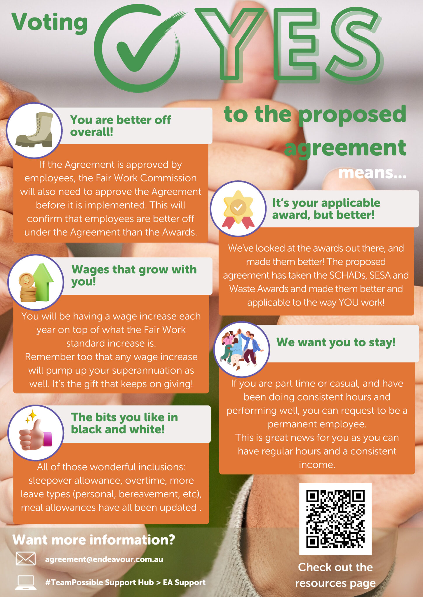 The proposed agreement has been drafted based on the bargaining representatives, which has included unions, self-represented employees, People & Wellbeing and leadership teams. The Union have communicated that they are supportive of a yes vote.