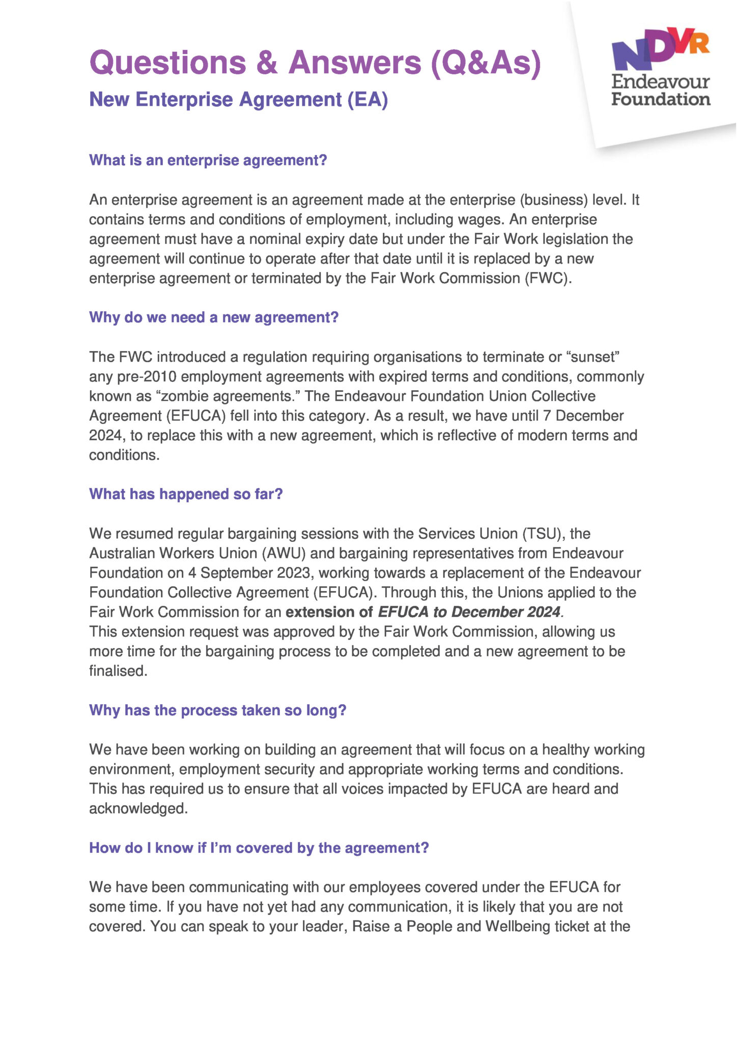 The Fair Work Commission is a commission that overseas all employment matters across all organisations. The agreement our employees are on doesn’t matter in regard to still getting support from the Fair Work Commission.