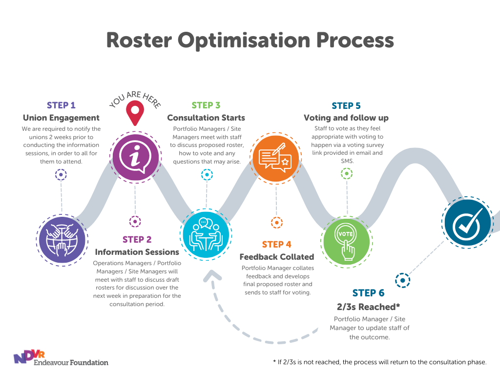 The roster consultation process is set out in the Endeavour Foundation Union Collective Agreement (EFUCA). The timetable of events during consultation is highlighted in the graphic above.